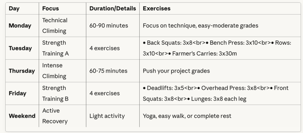 Train 4 days per week: 2 climbing days, 2 lifting days. Start light—your body needs time to adapt.